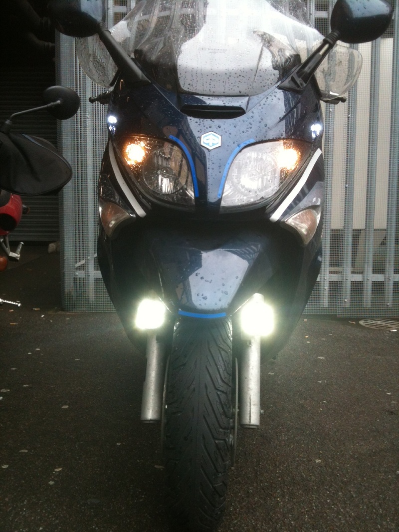 Anils Piaggio X400 has BikeVis Bullet and Cree DRLs to improve frontal visability, thanks for sharing.